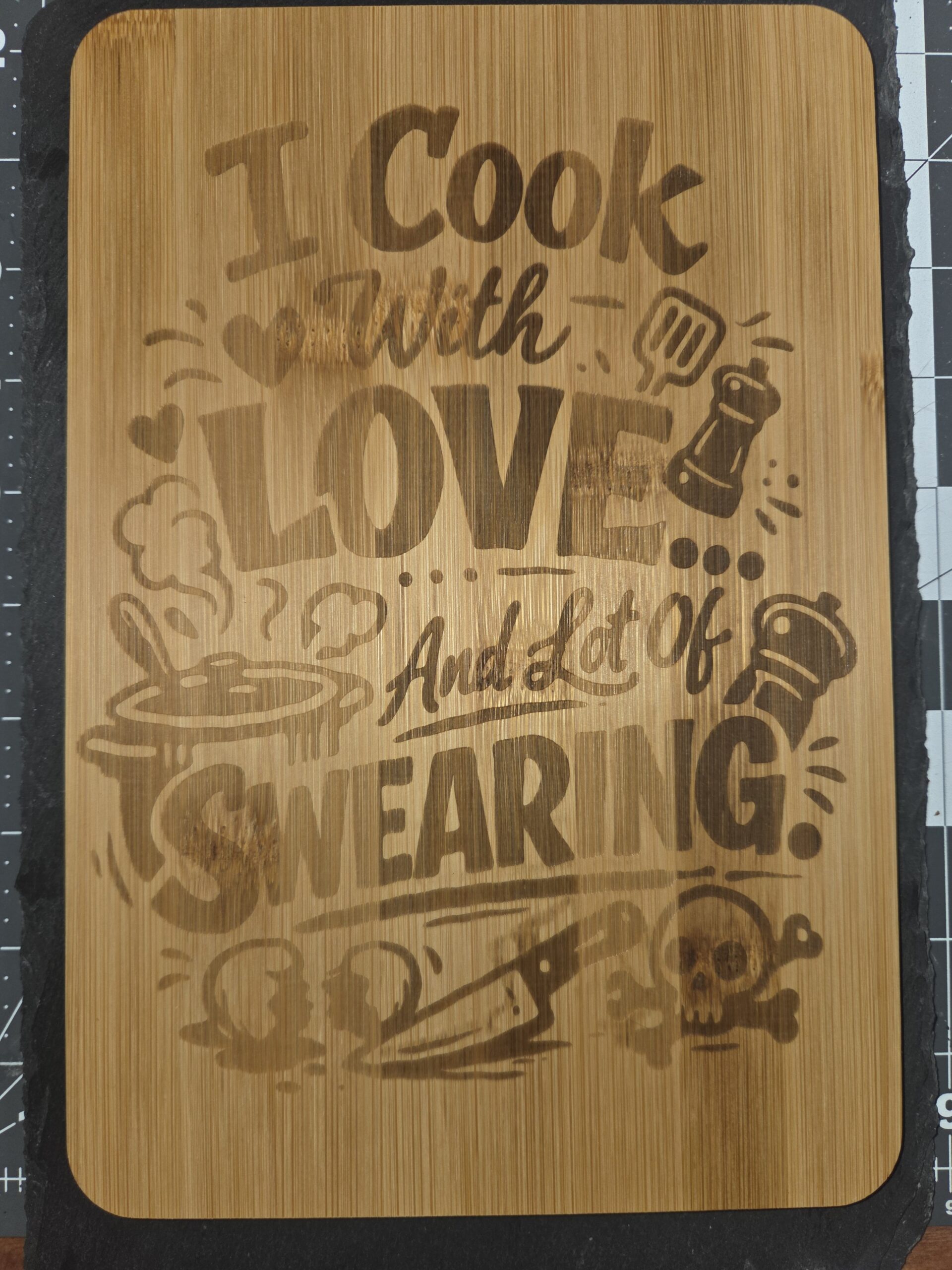 “I cook with LOVE and lot of SWEARING” Laser engraved 6.75 x 10 inch bamboo cutting board. The board is treated with food grade Butcher Block Conditioner. The cutting board is intended to be decorative in use. Although, the conditioning does make it food safe.