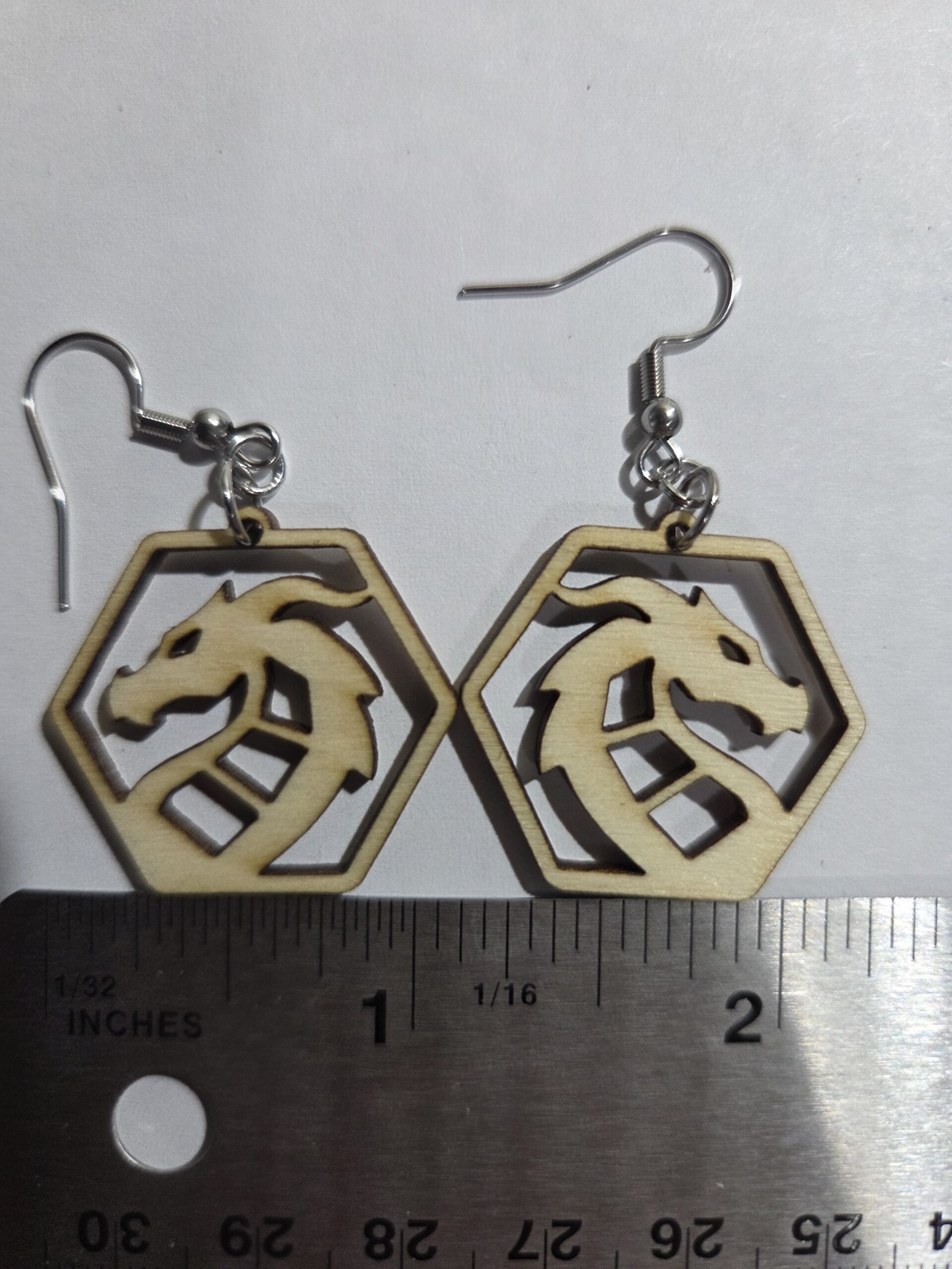 Dragon Earrings ranging from roughly 2.25 in x 2.25 inch down to 1 in x 1 in. All made from lightweight wood.