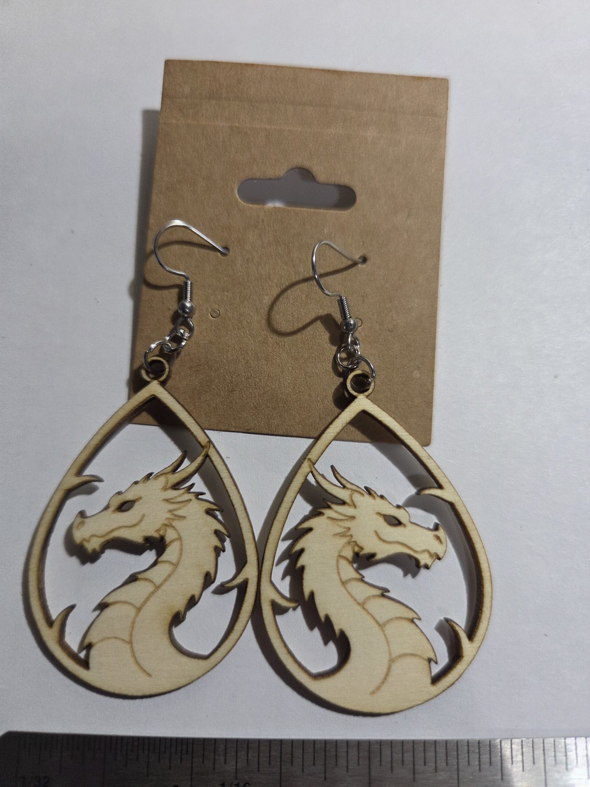 Dragon Earrings ranging from roughly 2.25 in x 2.25 inch down to 1 in x 1 in. All made from lightweight wood.
